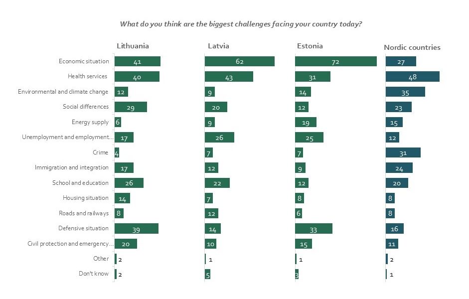 These insights emerge from the latest survey commissioned by the Nordic Council of Ministers Office in Lithuania, covering public opinion in Lithuania, Latvia, and Estonia. A comparable survey in the Nordic countries revealed different priorities, with healthcare leading as the top concern, followed by environmental and climate change and rising crime.