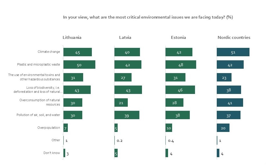 Still, when asked about specific environmental threats, Baltic respondents consistently highlighted plastic and microplastic pollution, climate change, and biodiversity loss. Nordic residents agreed on climate change but prioritized overconsumption of natural resources over biodiversity loss.